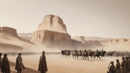 Travelers ride camels across sandy dunes, approaching ancient ruins illuminated by starlight, evoking a sense of wonder and exploration in a serene atmosphere