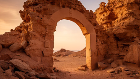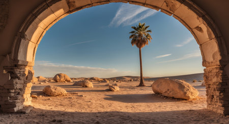 AI Generated. Palm Tree View Through a Ruined Archway in a Desert Landscape