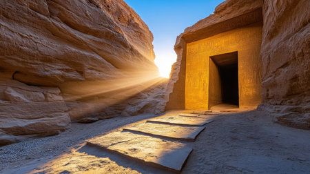 Explore a stunning ancient temple entrance bathed in warm sunlight, framed by breathtaking rock formations. A perfect blend of history and nature.