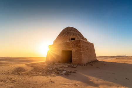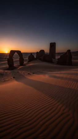 Ancient desert ruins, including an archway with a sunburst, stand amidst rippled sand dunes at sunrise.