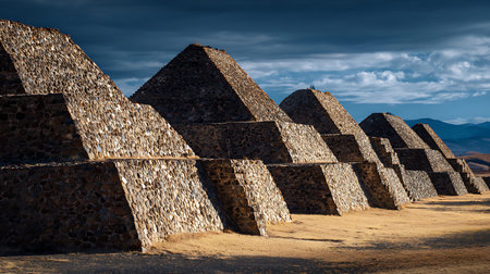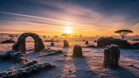 Ancient stone ruins stand majestically at sunrise in a serene landscape
