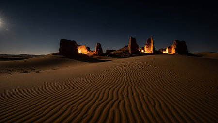 Ancient, crumbling desert ruins are bathed in warm, glowing light against a dark night sky, with the foreground dominated by intricately rippled sand dunes.