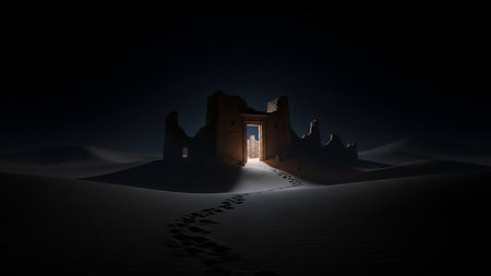 An ancient ruin in the desert at night, with footprints leading to a brightly lit doorway, creating a sense of mystery.
