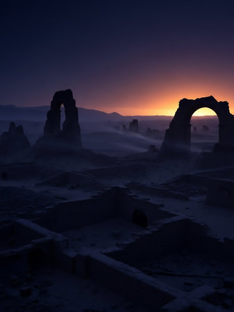 Ancient stone ruins and arches are silhouetted against a vibrant sunset sky, with fog obscuring the desert landscape and creating a mysterious atmosphere.