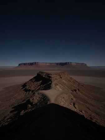 A striking desert landscape featuring a prominent mesa in the foreground and a distant plateau under a deep blue, clear sky. Stark shadows highlight the rugged terrain and geological formations.