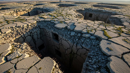 Category: showing aerial view of a vast, decaying concrete structure with numerous circular openings and collapsed sections revealing interior spaces and exposed...