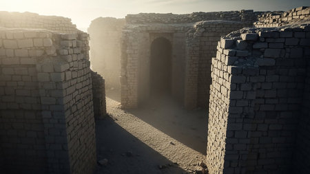 Ancient stone ruins with weathered brick walls and arched doorways are bathed in ethereal shafts of sunlight, casting long shadows across the sandy ground.