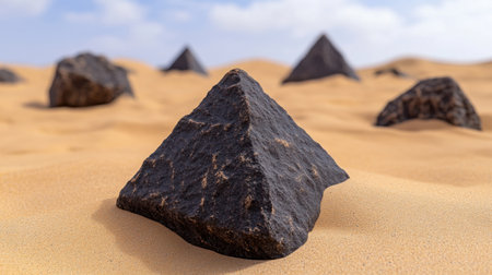 Jagged dark rocks shaped like pyramids scattered across pale sandy surface, evoking a lunar desert