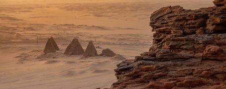 Background with the pyramids of Karima, Sudan, and the corner of the holy mountain Jebal Barkal in the foreground.