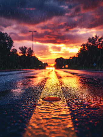 Vibrant sunset glow casts a warm dramatic light over a wet city road at dusk Reflective puddles line the asphalt surface creating a serene and tranquil atmosphere amidst the urban landscape