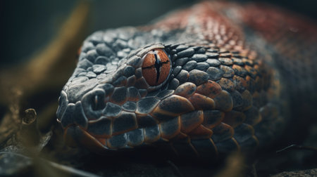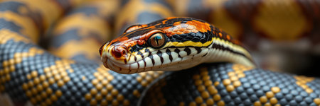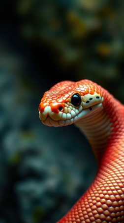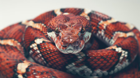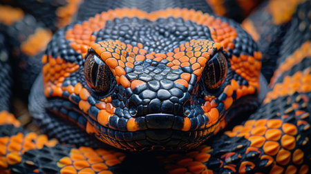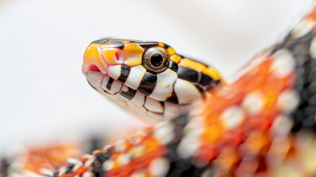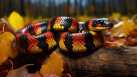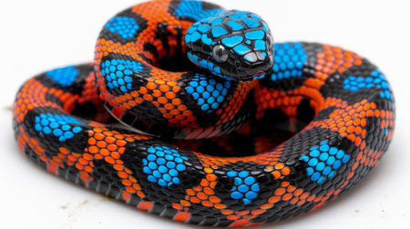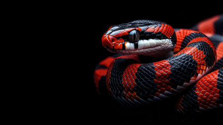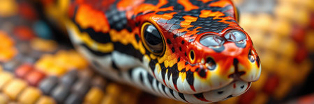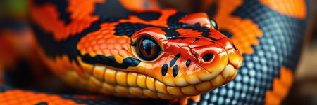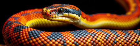 A vivid and colorful snake coils elegantly, its scales shimmering with intense hues of red, orange, and black.