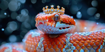 A snake wearing a crown, coiled on snow, creating a whimsical and regal scene in a winter setting. High quality photo