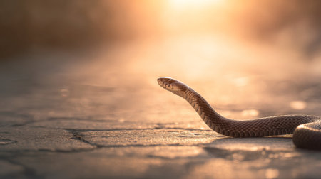 A tranquil snake gracefully slithers along a sunlit pathway, capturing the essence of wildlife in nature during golden hour, with soft warmth enveloping the scene.
