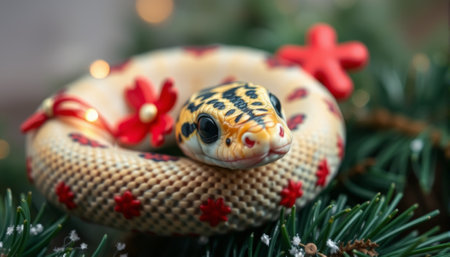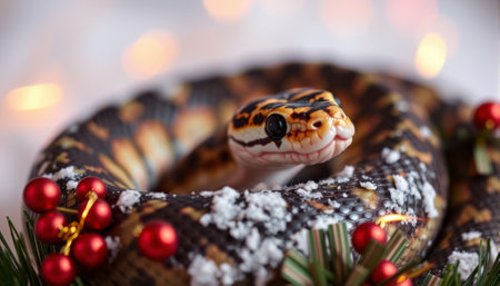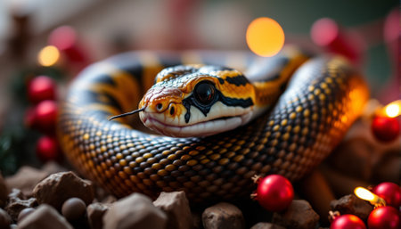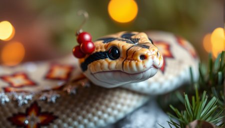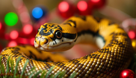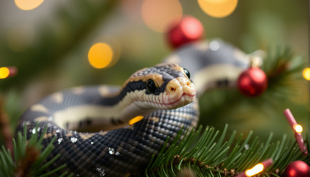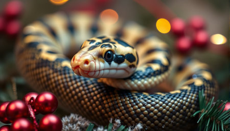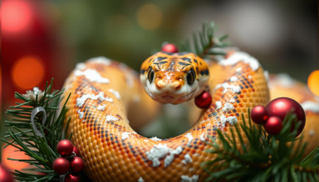 Snake and Christmas tree background. AI generated.