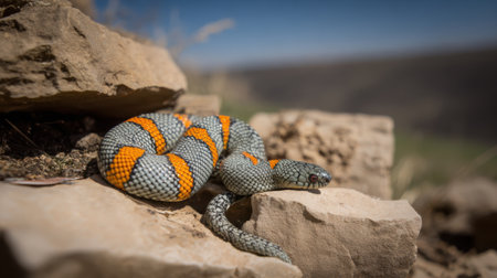 A close-up of a colorful snake with orange and gray bands, coiled on weathered rocks with a blurred natural landscape in the background.