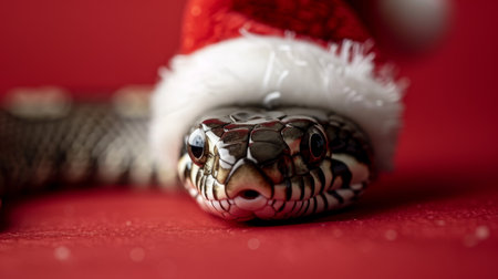 Cute Snake Wearing a Santa Hat on Red Background for Christmas Festive Cheer. Copy Space.