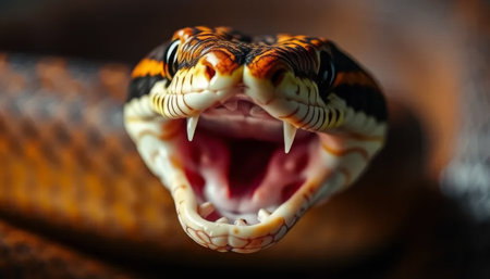 Close-up of the head of a snake with open mouth sharp teeth