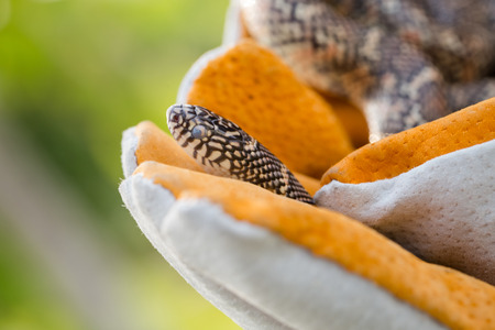 Lampropeltis getula meansi, commonly known as Apalachicola Kingsnake, protect danger from snake by leather glove