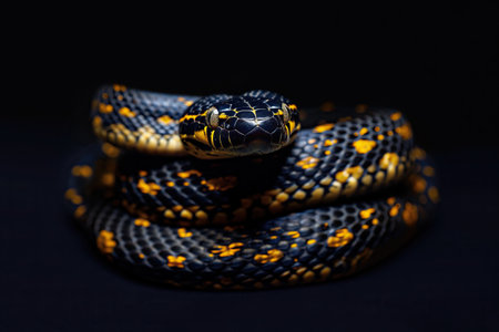 The coiled snake rests gracefully, displaying its mesmerizing scales and unique color patterns against a dark background, capturing the beauty and elegance of this reptile.