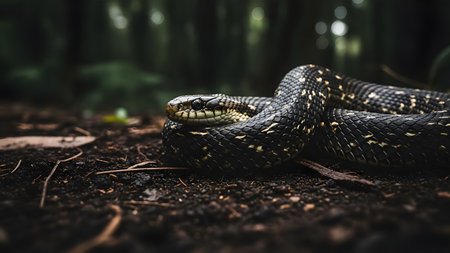 A black snake with yellow speckles is coiled on the dark, earthy floor of a forest. The reptile's scales glisten slightly in the dim light, and its head is raised alertly, showcasing the beauty and mystery of wildlife in its natural habitat.
