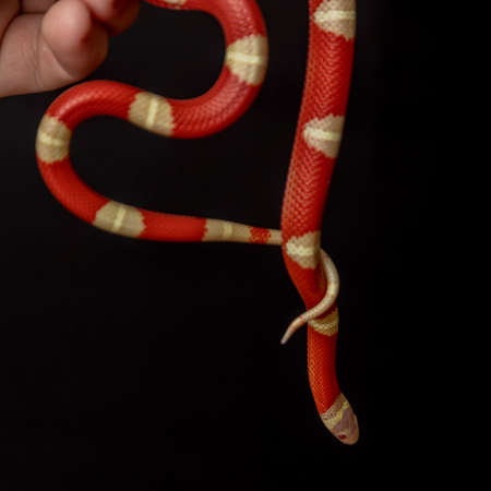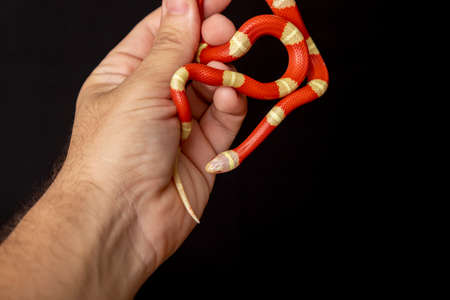 Man holds in hands reptile Milk snake Lampropeltis triangulum Arizona kind of snake.