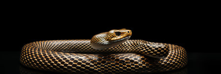 Black and gold snake on a black background. Beautiful reptile, studio shot