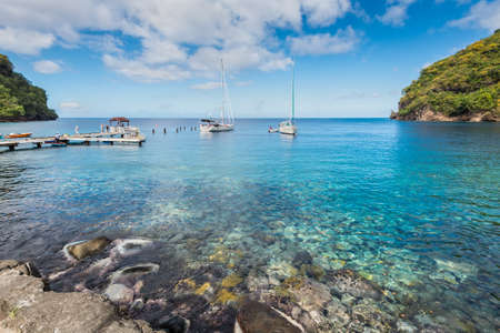 Wallilabou Bay, Saint Vincent and the Grenadines - December 19, 2018: A view from a jetty out to sea at Wallilabou Anchorage - Pirates of the Caribbean's Port Royale - Saint Vincent.