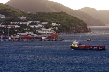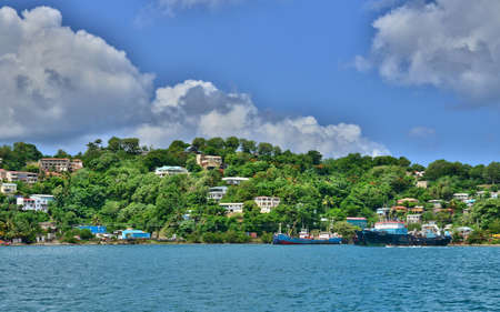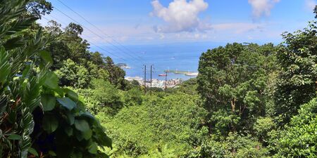 Campden Park, Saint Vincent and the Grenadines - December 19, 2018: Landscape of the island of Saint Vincent. The Campden Park industrial zone and Container Port in the foreground. Sea, mountainous coast and bay.