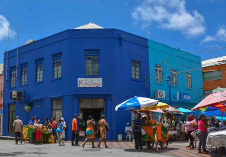 Bridgetown, Barbados, Caribbean - 22 Sept 2018: Beautiful colorful blue house in Bridgetown with a shopping area in front of it. Copy space