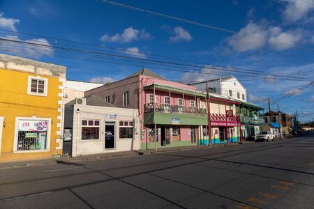 Bridgetown, Barbados, Caribbean - 22 Sept 2018: The street with beautiful colorful houses in Bridgetown. White clouds in the blue sky. Copy space