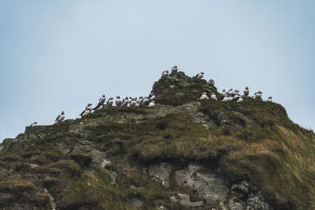 Closeup of a flock of puffins on a rocky shore of the Farne Islands in Northumberland, England