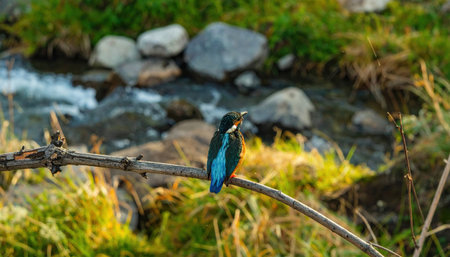 A vibrant bird displays its colorful feathers while resting on a branch beside a flowing stream. This serene and peaceful nature scene captures the essence of wildlife.