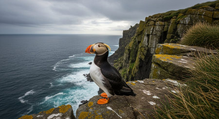 Explore the mesmerizing world of puffins with this stunning close-up shot, capturing the intricate details of a puffin's face and its focused eyes. every feather and expression tells a unique story