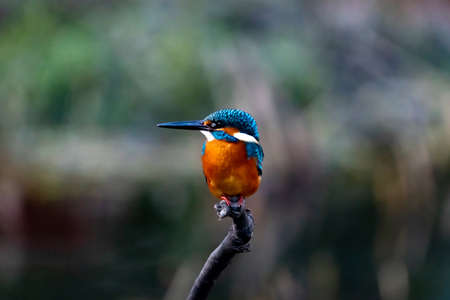 Common Kingfisher (Alcedo atthis) sitting on a branch above a pool in the forest in the Netherlands. Dark green background. Copyspace.