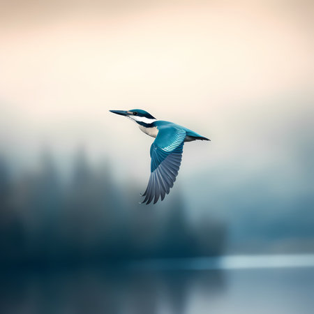 A lone bird gracefully navigates through the dense mist above a still lake as droplets fall softly around it. The serene atmosphere captures a moment of peace and solitude in the wilderness.