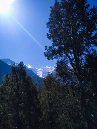 Snow covered mountains against green trees with the sun shining in the blue sky