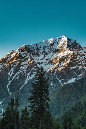 Landscape of mountain range covered with snow in Manali during summers, captured during the sunset with mist and fog