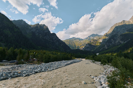 A serene mountain landscape features a rocky riverbed winding through a valley under a clear blue sky, with forested slopes and distant peaks offering a tranquil outdoor scene.