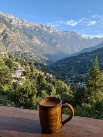 A coffee mug filled with a warm beverage rests on a wooden surface. Lush green trees and vegetation fill the valley, with rugged mountain peaks in the background. The scene suggests an outdoor setting, possibly during the daytime, and could be utilized in commercial projects or editorial content.