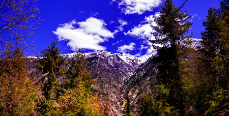 In the front pine woods on background Himalayan mountans and sky with clouds