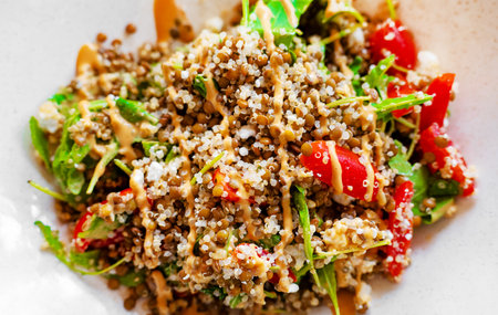 Quinoa salad for vegan food with leaves of healthy fresh salad