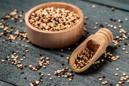 Pile of mixed raw quinoa (Three colors) in wooden bowl on grey background. Quinoa provides protein, dietary fiber, B vitamins, and dietary minerals in rich. Super food of life.