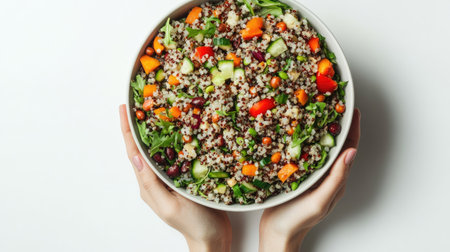A nourishing bowl of fresh quinoa salad held in hands, featuring vibrant vegetables, perfect for healthy meals or meal prep. Ideal for any cuisine.