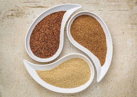 three tiny gluten free grains - kaniwa, amaranth and teff on teardrop shaped bowls against white painted rustic wood