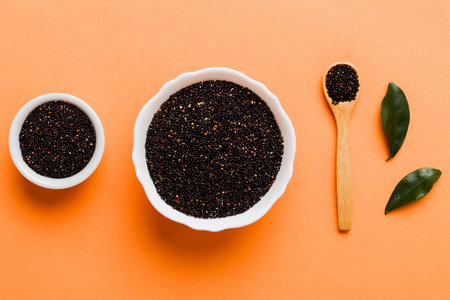A group of quinoa seeds on wooden spoon and grais of quinoa in black bowl .