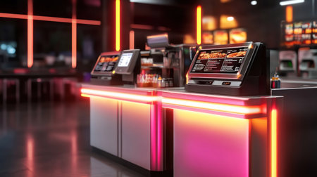 Modern self-service touchscreen system for ordering meals in a clean fast food setting, ideal for digital retail concepts.
