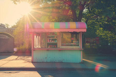 A photo of a small ice cream stand situated on the roadside, showcasing a variety of tasty frozen desserts, A colorful ice cream stand on a sunlit boulevard, AI Generated