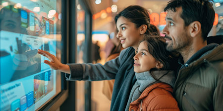 A woman wearing a warm winter coat and backpack stands in a busy shopping mall, engaging with a modern digital information kiosk.