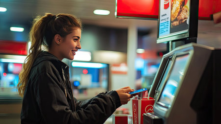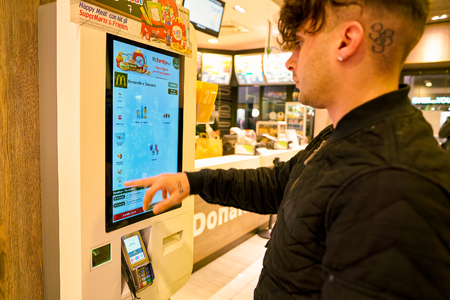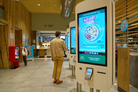 MILAN, ITALY - CIRCA NOVEMBER, 2017: customer at a McDonald's store place orders and pay through self ordering kiosk.
