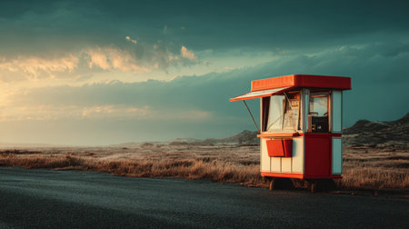A rustic snack stand sits alone by the roadside, bathed in warm sunset light, capturing the essence of adventure and solitude in a vast landscape.